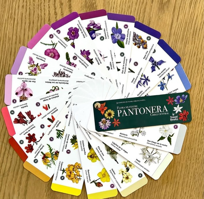 Esta guía formato pantonera incluye 70 flores que podemos avistar a lo largo de la zona central de Chile. La pantonera está ordenada por colores y cada especie está marcada con una ‘N’ para Nativa y una ‘E’ para Endémica, según sea el caso.